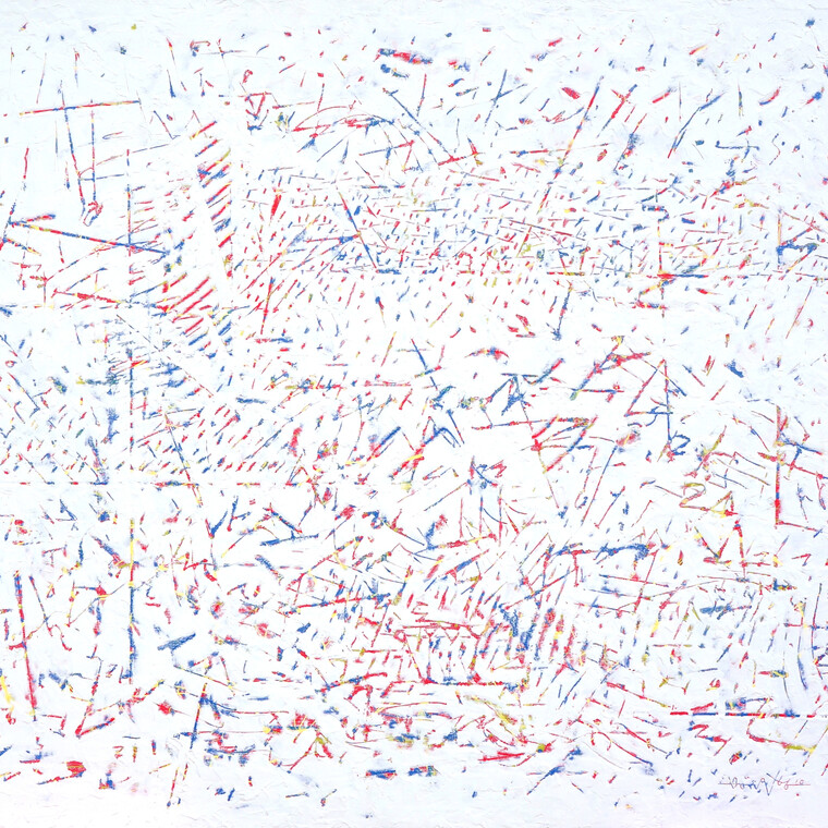 • [평론] 박동수의 작품은 원색 계통의 물감을 흘려 뿌려 뒤덮은 화면 위에 흰 안료를 전체적으로 두께 있게 입힌 후, 그 다음에 여러 가지 이미지를 선과 면으로 긁어내는 스크레이핑(scraping) 기법을 사용한다. 아래에 있 는 원색의 물감 층은 직관, 본능, 무의식, 꿈 등의 역동적 영역이며, 위를 덮은 흰 안료 층은 현실, 이성, 개념 등의 의식적 영역이다. 그의 작품은 이 두 영역 사이에 작용하는 긴장과 이완의 관계를 역동적으로 매개하는 것이며, 그 가운데 조화롭고 생동적인 이미지를 표현해 내는 것이다. 긁어내어 드러난 이미지들은 변증법적 발전을 거친 또 하나의 이른바 ‘순수하게 정제되고 집약된 역동 성’을 느끼게 해 준다. 유명한 미술사가인 빈켈만이 말한 ‘고귀한 단순과 고요한 위대’에 비견된다. 실제 그의 작품을 조금 떨어져서 거리를 두고 보면, 화면 전체를 가득 채운 선들은 전면균질회화(All Over Painting)를 이루면서 동양적 사유가 깃든 고요한 역동성을 느낄 수 있다.