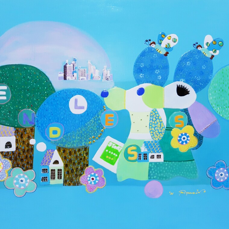 • [작가노트] 본인의 작품제작의 주제는 자연이며 자연을 시각상의 대상으로 보지 않고 작가가 경험하는 자신의 감각과 느낌을 형상화 시키고 있다. 최근 작품에는 강아지가 등장하는데 나와 함께 오랜 시간을 함께한 그림자와도 같은 존재이다. 강아지와 음악은 나의 삶에 행복을 가져다주고 평생을 같이할 동반자의 개념이다. 강아지에 대한 작가의 무한한 사랑을 다소 의인화시켜 밝고 화면속에서 친숙하게 표현하면서 그것들로부터 느껴지는 따스한 행복감들을 작가만의 캐릭터로서 이미지화 하였다. 작품기법면에서는 강아지 형상에다가 작가만의 자연을 바라보는 느낌을 콜라쥬와 물감 그리고 다른 친숙한 미디어 재료들을 이용했으며 화려하면서도 밝은 색조로서 구성하여 보았다. 현대적인 느낌을 살리기 위한 resin 작업도 병행하였다. 작품 속에 작은 동화 이야기와도 같은 맑고 깨끗한 숨겨진 이야기를 넣어 사람들의 마음속에 더욱더 친숙한 존재로서 다가오도록 하였다. 화면 위에서 펼쳐지는 색면의 움직임들은 마치 우주라는 공간 안에서 음악의 연주를 연상시키는 듯 그들만의 언어로서 특별한 관계를 만들어내게 되고 신비로운 모종의 느낌과 이미지를 탄생시키게 된다. 윤곽을 만들어내는 과정을 더하면서 작품의 풍부한 표정이 탄생되고 작품의 전체적인 느낌도 다가오게 된다. 작가는 보다 원색적이면서도 화려한 색깔을 자주 이용하는데 행복감의 표현을 화려한 색채로서 표현하고자 하였다. 기존의 나의 비구상 작품에서 보여지는 상징적인 표현도 역시 자주 등장하게 되는데 작가가 즐겨 표현하는 원과 같은 둥근 이미지는 작가만의 아이콘과 같은 기호라고 말하고 싶다. 둥근 이미지가 주는 느낌은 음악의 리듬, 음표, 자연의 순환, 행복의 느낌들이라고 말할 수 있겠다.