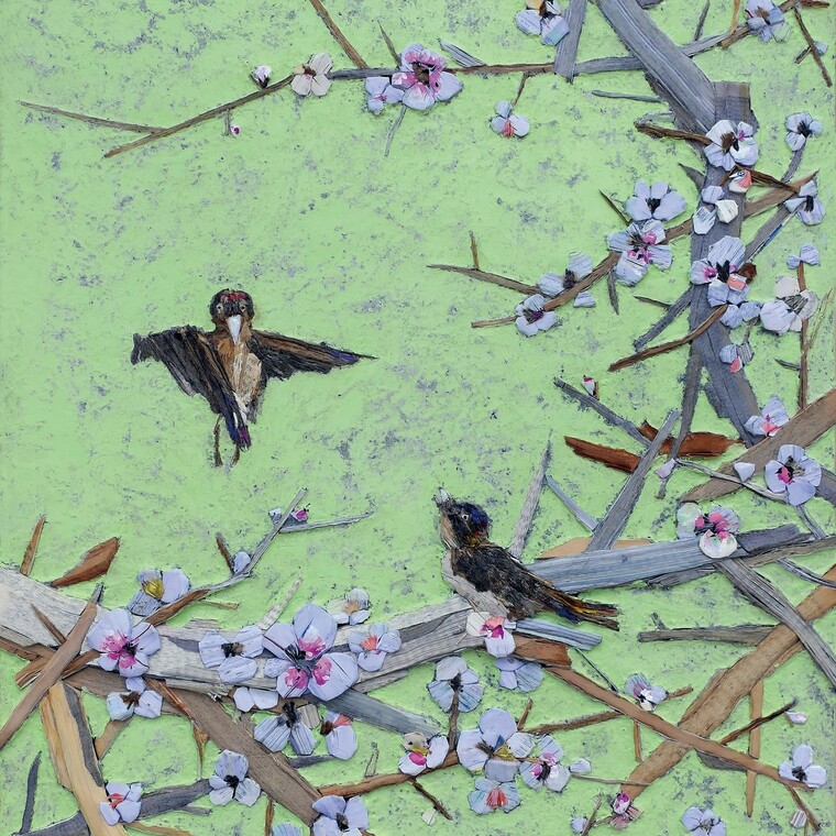 • [작가노트] “책들의 풍경 속” 나의 주변, 가장 가까운곳에서부터 작품을 위한 이미지를 선택한다. 나는 생산자라기 보다는 발굴가나 채집가에 가까운 태도로 이미지를 선택하며, 그들의 색과 명암이 소멸되고 사적인 감정이 배제된 축약적인 결과물로 추출되는 과정을 거쳐, 결국 그들의 대상으로부터의 출발과 이탈, 현실과 현실 부정, 그리고 실제와 이미지의 상반된 욕망 위에서 존재하게 된다. 이러한 의미에서 근작은 “책장 앞에 정리되지 않고 아무렇게나 쌓아놓은 책들”의 풍경 속에서 책이 가지고 있는 상징성을 이용한 시간과 공간, 화면의 확장을 위한 여러번 겹쳐 칠한 많은 선으로 이루어진 면들과 오브제를 통해 우리가 현실에서 흔히 볼 수 없는 환상의 공간이지만 우리가 감지할 수 있는 절대 공간이기도 한 그 속에서 울려 퍼지는 침묵의 소리를 표현하고 싶었다. [평론] 책으로 그린 자연이미지 식민지시대 최고의 문장가로 알려진 이태준은 책은 꼭 冊이라고 써야 제격이라고 말했다. 죽간본의 형태에서 따온 이 상형문자는 책이 꿰고 있는 많은 이야기를 함축해서 전달한다. 한 권의 책에는 너무 많은 말들이 고여 있고 응고되어 있다. 책을 펼치면 행간에 머물러 있던 무수한 말들이 기립해 다가온다. 활자들이 기지개를 켜고 망막으로, 뇌 속으로 함성처럼 스며드는 것이다. 책을 덮으면 다시 말들은 문자꼴로 결박되어 고요하다. 책장에 꽂힌 책의 등에 적힌 책의 제목은 그 책 안에 가득할 말들을 연상시켜 준다. 유혹한다. 무수한 책들로 가득한 책장이나 서재는 헤아릴 수 없는 말, 문자들로 가득해 울울하고 침침하다. 책을 펼치는 행위는 그 말들을 환생시키는 일이다. 그런데 이정웅은 책을 펼칠 수 없게 봉한 후에 오른쪽에서 왼쪽으로, 책의 경계에서 책등을 향해 단호한 칼질을 해댄다. 책을 잘게 썰고 토막낸다. 책으로 회를 떠낸다. 책을 망실시키는 행위이자 가혹한 훼손이다. 펼칠 수 없는 책, 읽을 수 없는 책으로 만드는 일이고 문자들을 죄다 붙여버리거나 칼에 의해 지워놓은 꼴이다. 모든 페이지는 접착제로 인해 들러 붙어버렸다. 그래서 펼칠 수 없다. 펼쳐지지 않는 책은 책이 아니라 사물, 오브제가 되었다. 그렇게 붙어버린 책은 불구다. 쓸모없는 책, 다시는 살아 날 수 없는 말들, 문자들, 모든 이야기의 죽음, 행간의 침묵이고 언어의 봉인이다. 온갖 책들이 이정웅의 칼과 본드에 의해 무참히 해체되었다. 이제 한 권의 두툼한 책은 얇은 띠로 바뀌었다. 수직으로 내려 그은 칼에 의해 지층으로 굳은 책의 일부가 흩어졌다. 그것은 문맥을 의도적으로 뒤바꾸고 동일한 시간 아래 다양한 내용들을 깊이로 내려가 떠낸 자취가 되어 고착되었다. 그렇게 작가는 책을 자르고 분쇄했다. 오로지 얇은 띠로 남겨진 책의 잔해는 원래의 책이 지닌 내용을 파기한 체 종이의 체적, 오브제로 남겨진 것이다. 수직으로 내려가 깊게 자른 칼은 책의 신체를 절개하고 토막 낸다. 잔혹하다. 이제 책의 몸은 사라지고 파편화된 책의 일부분만 처연하게 뒹군다. 작가는 그 조각, 파편들을 다시 추스려 화면 위에 부착했다. 콜라주 했다. 길쭉하고 약간의 두께를 지닌 그 조각들을 연결해 정물화나 초충도, 사군자 등을 연상시키는 그림을 그렸다. 부착했다. 식물 이미지와 새 이미지가 두드러지게 자리한다. 종이로 그림을 그리고, 종이를 집적해 일종의 부조, 입체를 만들었다. 이 오브제 회화는 무척 촉각적이다. 꽃과 나무, 풀과 새가 함께 그려, 부착되었다. 그러나 그것은 종이, 책의 단면들이 수평으로 자리하면서 만든 이미지, 흔적이다. 작가는 캔버스 화면에 붓으로 밑그림을 그린 후 그 위에 종이/책을 붙였다. 제각기 다른 길이와 두께, 드문드문 비치는 색상, 종이의 재 질, 오래되고 누렇게 빛바랜 종이의 상태들이 물감을 대신해 형상을 안긴다. 다양한 표정을 만든다. 붓, 모필로 밑그림을 그리고 그 위 에 그 필력이 고스란히, 더 생생하게 연상되도록 종이를 콜라주하고 있다. 그가 붙인 종이, 책의 단면에서 소리가 난다. 획의 소리가 난다. 그는 전통 문인화나 화조화를 새삼 책으로, 종이로 재현한다. 나로서는 정물화 보다는 사군자나 화조화 같은 것이 좋다. 앞의 것이 지나치게 장식적이고 작위성이 강하다면 후자는 필의 맛과 호흡이 느껴지고 더불어 가락이 있다. 흡사 남도 판소리 같은 가락 말이다. 분명 종이/책이 자연을 떠올려주고 식물과 나무로 환생했다. 작가는 책의 단면을 부착한 후 그 주변은 종이를 주물러 만든 종이죽(모든 이야기를 뒤섞고 혼합해버린)을 부착해 채워나갔다. 또는 아크릴과 핸디코트를 섞어서 칠을 하거나 색모래와 모래, 접착제 등을 혼합해 부착했다. 그에 따라 촉각적인 화면이 도포되었다. 그런 후에 그라인더로 단호하게 갈아내고 부분적으로 종이결을 깍아내어 속 도감, 시간성, 요철효과 등을 안긴다. 그는 칼과 그라인더, 접착제로 그림을, 조각을 하고 있다. 그라인더로 긁고 손으로 치고 모필로 밑 그림을 그리는 이 모든 행위의 저간에는 사군자를 치던 문인들의 제스처와 호흡, 운필의 리듬이 느껴진다. 기운생동이 감촉된다. 작가는 말하기를 