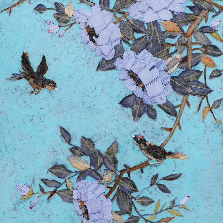 • [작가노트] “책들의 풍경 속” 나의 주변, 가장 가까운곳에서부터 작품을 위한 이미지를 선택한다. 나는 생산자라기 보다는 발굴가나 채집가에 가까운 태도로 이미지를 선택하며, 그들의 색과 명암이 소멸되고 사적인 감정이 배제된 축약적인 결과물로 추출되는 과정을 거쳐, 결국 그들의 대상으로부터의 출발과 이탈, 현실과 현실 부정, 그리고 실제와 이미지의 상반된 욕망 위에서 존재하게 된다. 이러한 의미에서 근작은 “책장 앞에 정리되지 않고 아무렇게나 쌓아놓은 책들”의 풍경 속에서 책이 가지고 있는 상징성을 이용한 시간과 공간, 화면의 확장을 위한 여러번 겹쳐 칠한 많은 선으로 이루어진 면들과 오브제를 통해 우리가 현실에서 흔히 볼 수 없는 환상의 공간이지만 우리가 감지할 수 있는 절대 공간이기도 한 그 속에서 울려 퍼지는 침묵의 소리를 표현하고 싶었다. [평론] 책으로 그린 자연이미지 식민지시대 최고의 문장가로 알려진 이태준은 책은 꼭 冊이라고 써야 제격이라고 말했다. 죽간본의 형태에서 따온 이 상형문자는 책이 꿰고 있는 많은 이야기를 함축해서 전달한다. 한 권의 책에는 너무 많은 말들이 고여 있고 응고되어 있다. 책을 펼치면 행간에 머물러 있던 무수한 말들이 기립해 다가온다. 활자들이 기지개를 켜고 망막으로, 뇌 속으로 함성처럼 스며드는 것이다. 책을 덮으면 다시 말들은 문자꼴로 결박되어 고요하다. 책장에 꽂힌 책의 등에 적힌 책의 제목은 그 책 안에 가득할 말들을 연상시켜 준다. 유혹한다. 무수한 책들로 가득한 책장이나 서재는 헤아릴 수 없는 말, 문자들로 가득해 울울하고 침침하다. 책을 펼치는 행위는 그 말들을 환생시키는 일이다. 그런데 이정웅은 책을 펼칠 수 없게 봉한 후에 오른쪽에서 왼쪽으로, 책의 경계에서 책등을 향해 단호한 칼질을 해댄다. 책을 잘게 썰고 토막낸다. 책으로 회를 떠낸다. 책을 망실시키는 행위이자 가혹한 훼손이다. 펼칠 수 없는 책, 읽을 수 없는 책으로 만드는 일이고 문자들을 죄다 붙여버리거나 칼에 의해 지워놓은 꼴이다. 모든 페이지는 접착제로 인해 들러 붙어버렸다. 그래서 펼칠 수 없다. 펼쳐지지 않는 책은 책이 아니라 사물, 오브제가 되었다. 그렇게 붙어버린 책은 불구다. 쓸모없는 책, 다시는 살아 날 수 없는 말들, 문자들, 모든 이야기의 죽음, 행간의 침묵이고 언어의 봉인이다. 온갖 책들이 이정웅의 칼과 본드에 의해 무참히 해체되었다. 이제 한 권의 두툼한 책은 얇은 띠로 바뀌었다. 수직으로 내려 그은 칼에 의해 지층으로 굳은 책의 일부가 흩어졌다. 그것은 문맥을 의도적으로 뒤바꾸고 동일한 시간 아래 다양한 내용들을 깊이로 내려가 떠낸 자취가 되어 고착되었다. 그렇게 작가는 책을 자르고 분쇄했다. 오로지 얇은 띠로 남겨진 책의 잔해는 원래의 책이 지닌 내용을 파기한 체 종이의 체적, 오브제로 남겨진 것이다. 수직으로 내려가 깊게 자른 칼은 책의 신체를 절개하고 토막 낸다. 잔혹하다. 이제 책의 몸은 사라지고 파편화된 책의 일부분만 처연하게 뒹군다. 작가는 그 조각, 파편들을 다시 추스려 화면 위에 부착했다. 콜라주 했다. 길쭉하고 약간의 두께를 지닌 그 조각들을 연결해 정물화나 초충도, 사군자 등을 연상시키는 그림을 그렸다. 부착했다. 식물 이미지와 새 이미지가 두드러지게 자리한다. 종이로 그림을 그리고, 종이를 집적해 일종의 부조, 입체를 만들었다. 이 오브제 회화는 무척 촉각적이다. 꽃과 나무, 풀과 새가 함께 그려, 부착되었다. 그러나 그것은 종이, 책의 단면들이 수평으로 자리하면서 만든 이미지, 흔적이다. 작가는 캔버스 화면에 붓으로 밑그림을 그린 후 그 위에 종이/책을 붙였다. 제각기 다른 길이와 두께, 드문드문 비치는 색상, 종이의 재 질, 오래되고 누렇게 빛바랜 종이의 상태들이 물감을 대신해 형상을 안긴다. 다양한 표정을 만든다. 붓, 모필로 밑그림을 그리고 그 위 에 그 필력이 고스란히, 더 생생하게 연상되도록 종이를 콜라주하고 있다. 그가 붙인 종이, 책의 단면에서 소리가 난다. 획의 소리가 난다. 그는 전통 문인화나 화조화를 새삼 책으로, 종이로 재현한다. 나로서는 정물화 보다는 사군자나 화조화 같은 것이 좋다. 앞의 것이 지나치게 장식적이고 작위성이 강하다면 후자는 필의 맛과 호흡이 느껴지고 더불어 가락이 있다. 흡사 남도 판소리 같은 가락 말이다. 분명 종이/책이 자연을 떠올려주고 식물과 나무로 환생했다. 작가는 책의 단면을 부착한 후 그 주변은 종이를 주물러 만든 종이죽(모든 이야기를 뒤섞고 혼합해버린)을 부착해 채워나갔다. 또는 아크릴과 핸디코트를 섞어서 칠을 하거나 색모래와 모래, 접착제 등을 혼합해 부착했다. 그에 따라 촉각적인 화면이 도포되었다. 그런 후에 그라인더로 단호하게 갈아내고 부분적으로 종이결을 깍아내어 속 도감, 시간성, 요철효과 등을 안긴다. 그는 칼과 그라인더, 접착제로 그림을, 조각을 하고 있다. 그라인더로 긁고 손으로 치고 모필로 밑 그림을 그리는 이 모든 행위의 저간에는 사군자를 치던 문인들의 제스처와 호흡, 운필의 리듬이 느껴진다. 기운생동이 감촉된다. 작가는 말하기를 