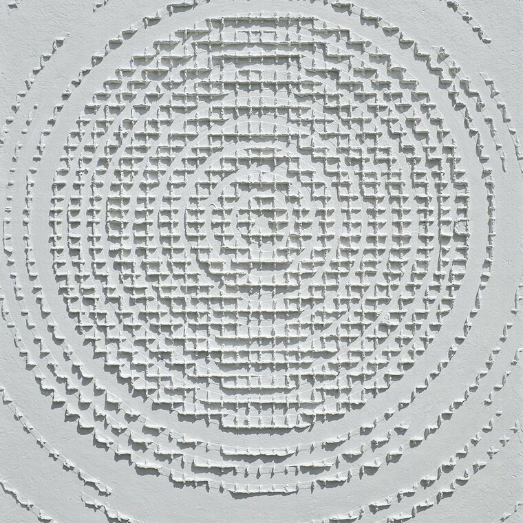• [작가노트] 관계 인간은 자연과의 어우러짐 속에서 그 근원을 점과 선을 통해 찾을 수 있으니... 끊임없이 이어지는 삶의 카테고리 속에서 반복의 질서를 통해 우주의 근본을 찾을 수 있을 것이다. 생명의 탄생과 반복적 경험을 점과 선을 통해 이야기하고자 한다. 끊임없이 이어지는 삶의 반복적 질서를 몸소 재현하듯 펼쳐진 펄프 위에 반복적 행위 속에서 드러나는 점 또는 선의 요철을 통해 자연과 호흡하고자 했으며, 그 공기는 리듬을 타고 이어진다. 주재료인 한지는 재료라는 개념과 작품의 개념이 분리되는 것이 아니라 그 자체로 작품이 되는데, 이는 곧 ‘바탕재료’적인 측면과 그 자체가 작품화 되는 ‘오브제’적인 두 가지 측면을 동시에 지니고 있다. 이러한 한지의 물성은 곧 작품 본연의 존재방식이라는 메시지가 되어 작품의 독자적인 매체로 작용하게 된다. 평면에서의 파장의 원을 입체적으로 표현함으로써 내면과 외면의 동일성을 보여줌과 동시에 음과 양의 조화를 꾀하고자 하였다.