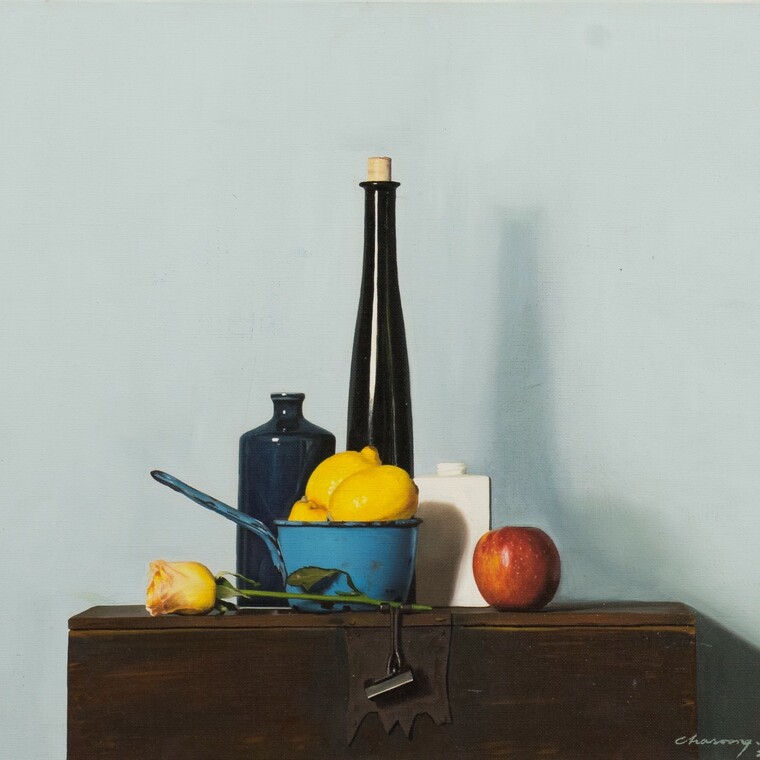 • [작가노트] 그림을 그리는 작업은 새로운 꿈을 꾸는 것이다. 거기 그 사물(being)이 그 적절한 자리에서 하나의 필수 불가결한 아름다운 대상이 되는 것, 그 대상들 하나하나가 나의 분신이 되고, 내 잃어버린 꿈의 파편이 된다. 떠도는 일상의 사물들이 새로운 이름을 주고, 더 아름답게 자리매김할 수 있도록 해 주고 싶다. 그들 각자는 이미 생명을 상실했지만, 하나의 그림이라는 공간에 놓여 짐으로 의미있는 시적 오브제의 재 탄생을 본다. 숨을 쉬는 그림, 그 대상들이 주는 더 미세한 호흡을 찾고 싶다. 마치 그려놓은 대상이 무생물체가 아닌, 무수한 꿈의 파편들이 부서져 그 잔해의 흔적을 극복하고 온전한 오브제가 되기까지 말이다. 상처 투성이의 아픈 심장을 가진 정물들을 나는 나의 그림 속에서 치유한다. 가장 께끗하고 온전한 것으로 표현되어 새로운 힘을 잉태하고 다시 하나의 커다란 힘에 응집되는 새로운 조화와 질서 위에 놓여지길 원한다. 나 스스로도 개입하길 원치않는 단지 거기 그 자리에 그들을 높여주는 일을 할 뿐이다. 그래서 굳이 내가 그들을 통해 무언가 말하려 하지 않아도 된다. 이 리얼리티의 벼랑 끝에서 그것들은 이미 현실의 being 이 아닌 것이다.제 2의 being 이 작품속에서 잉태하는 것이다. 작가 자신은 이제 붓을 내려놓는 이방인일 뿐이다. 작품이 자신들의 자리매김과 저마다의 색깔로 빛을 발할 때 쯤이면 나는 가끔 호흡을 멈춘다. 그들이 호흡하기 때문이다. 하나의 힘 안에 응집된 그들만의 질서, 거기 그 자리에 있어 흔들리지 않는 조화의 아름다움, 사물들 각자가 자존심을 회복하고, 어느날 아침 내가 눈을 떳을 때 그 미지의 공간에 그것들이 사라져 버릴 것 같은 두려움 때문이기도 하다. 새로운 자아의 탄생, 허물을 벗는 새로운 잉태, 벌거벗은 나신의 미지의 순수한 유혹, 그 낯선 시선 속에서 우리를 자각케 하고 체험케 한다. 혹 지나치기 쉬운 사실 안에서 가장 바른 사실의 긍정, 결코 억압하지 않고 자유로울 수 있는 자기 망각의 공간, 결코 세상에 존재하지 않는 참 긍정의 꿈의 영역,이것이 내가 표현하고자 하는 “사실”의 세계이다.