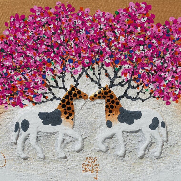 • [평론] 임근우의 유토피아를 꿈꾸는 ‘Cosmos-고고학적 기상도’ <말+젖소+기린>의 ‘유토피아 캐릭터’는 이상형동물 머리에 복숭아꽃을 활짝 피우고, 도원경(桃源境) 속에서 고고학적 무릉도원을 부유하며 꿈꾸는 ‘이시대의 행복 기상도’이자 현대판 <행복십장생도>이다. 그림에 등장하는 <말+젖소+기린>의 ‘유토피아 캐릭터’는 현대인이 꿈꾸는 이상형의 동물로서 역동성의 상징인 말과, 풍요의 상징인 젖소, 그리고 큰 키의 장점을 가진 기린이 합하여진 행복 캐릭터이다. 다시 말하면 말은 건강을 의미하며, 젖소는 부를 의미하고 기린은 명예를 의미 한다. 건강과 돈, 그리고 명예 이 세 가지를 가진 이상형 동물의 머리에서 나무가 자라나고 그 위에 복숭아 꽃을 피운 ‘유토피아 캐릭터’가 살고 있는 곳이 무릉도원이다. 땅에 뿌리를 내리고 사는 식물로서의 복숭아 꽃이 아니라 동물의 머리에 핀 복숭아 꽃은 배달민족(?)답게 심산유곡 어디든 배달이 가능하다. 그것을 모두에게 배달하고 싶다. 이 시대의 무릉도원이자 현대판 <행복십장생도>에는 이상형 동물 외에도 녹차 다완(茶碗)과 고고학자의 중절모자, 하트 무한대 도형, 간절히 기도하고 있는 나의 모습 등이 구름 기상도처럼 둥실둥실 떠다니며 자유로운 고고학적 시간여행을 즐기고 있다. 이 또한 모두와 함께 자유여행을 하고 싶다.