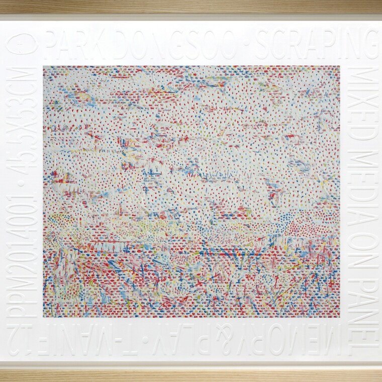 • [평론] 박동수의 작품은 원색 계통의 물감을 흘려 뿌려 뒤덮은 화면 위에 흰 안료를 전체적으로 두께 있게 입힌 후, 그 다음에 여러 가지 이미지를 선과 면으로 긁어내는 스크레이핑(scraping) 기법을 사용한다. 아래에 있 는 원색의 물감 층은 직관, 본능, 무의식, 꿈 등의 역동적 영역이며, 위를 덮은 흰 안료 층은 현실, 이성, 개념 등의 의식적 영역이다. 그의 작품은 이 두 영역 사이에 작용하는 긴장과 이완의 관계를 역동적으로 매개하는 것이며, 그 가운데 조화롭고 생동적인 이미지를 표현해 내는 것이다. 긁어내어 드러난 이미지들은 변증법적 발전을 거친 또 하나의 이른바 ‘순수하게 정제되고 집약된 역동 성’을 느끼게 해 준다. 유명한 미술사가인 빈켈만이 말한 ‘고귀한 단순과 고요한 위대’에 비견된다. 실제 그의 작품을 조금 떨어져서 거리를 두고 보면, 화면 전체를 가득 채운 선들은 전면균질회화(All Over Painting)를 이루면서 동양적 사유가 깃든 고요한 역동성을 느낄 수 있다.