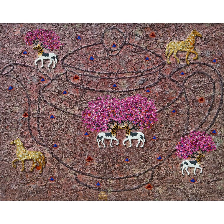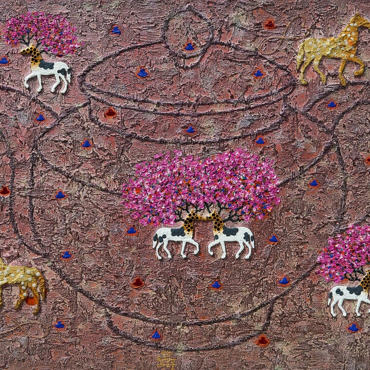 • [평론] 임근우의 유토피아를 꿈꾸는 ‘Cosmos-고고학적 기상도’ <말+젖소+기린>의 ‘유토피아 캐릭터’는 이상형동물 머리에 복숭아꽃을 활짝 피우고, 도원경(桃源境) 속에서 고고학적 무릉도원을 부유하며 꿈꾸는 ‘이시대의 행복 기상도’이자 현대판 <행복십장생도>이다. 그림에 등장하는 <말+젖소+기린>의 ‘유토피아 캐릭터’는 현대인이 꿈꾸는 이상형의 동물로서 역동성의 상징인 말과, 풍요의 상징인 젖소, 그리고 큰 키의 장점을 가진 기린이 합하여진 행복 캐릭터이다. 다시 말하면 말은 건강을 의미하며, 젖소는 부를 의미하고 기린은 명예를 의미 한다. 건강과 돈, 그리고 명예 이 세 가지를 가진 이상형 동물의 머리에서 나무가 자라나고 그 위에 복숭아 꽃을 피운 ‘유토피아 캐릭터’가 살고 있는 곳이 무릉도원이다. 땅에 뿌리를 내리고 사는 식물로서의 복숭아 꽃이 아니라 동물의 머리에 핀 복숭아 꽃은 배달민족(?)답게 심산유곡 어디든 배달이 가능하다. 그것을 모두에게 배달하고 싶다. 이 시대의 무릉도원이자 현대판 <행복십장생도>에는 이상형 동물 외에도 녹차 다완(茶碗)과 고고학자의 중절모자, 하트 무한대 도형, 간절히 기도하고 있는 나의 모습 등이 구름 기상도처럼 둥실둥실 떠다니며 자유로운 고고학적 시간여행을 즐기고 있다. 이 또한 모두와 함께 자유여행을 하고 싶다.