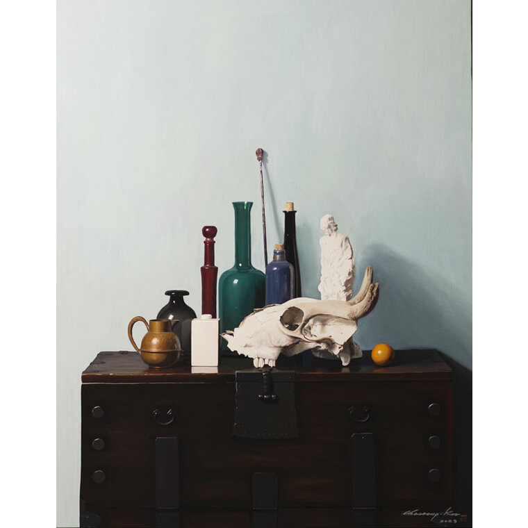 • [작가노트] 그림을 그리는 작업은 새로운 꿈을 꾸는 것이다. 거기 그 사물(being)이 그 적절한 자리에서 하나의 필수 불가결한 아름다운 대상이 되는 것, 그 대상들 하나하나가 나의 분신이 되고, 내 잃어버린 꿈의 파편이 된다. 떠도는 일상의 사물들이 새로운 이름을 주고, 더 아름답게 자리매김할 수 있도록 해 주고 싶다. 그들 각자는 이미 생명을 상실했지만, 하나의 그림이라는 공간에 놓여 짐으로 의미있는 시적 오브제의 재 탄생을 본다. 숨을 쉬는 그림, 그 대상들이 주는 더 미세한 호흡을 찾고 싶다. 마치 그려놓은 대상이 무생물체가 아닌, 무수한 꿈의 파편들이 부서져 그 잔해의 흔적을 극복하고 온전한 오브제가 되기까지 말이다. 상처 투성이의 아픈 심장을 가진 정물들을 나는 나의 그림 속에서 치유한다. 가장 께끗하고 온전한 것으로 표현되어 새로운 힘을 잉태하고 다시 하나의 커다란 힘에 응집되는 새로운 조화와 질서 위에 놓여지길 원한다. 나 스스로도 개입하길 원치않는 단지 거기 그 자리에 그들을 높여주는 일을 할 뿐이다. 그래서 굳이 내가 그들을 통해 무언가 말하려 하지 않아도 된다. 이 리얼리티의 벼랑 끝에서 그것들은 이미 현실의 being 이 아닌 것이다.제 2의 being 이 작품속에서 잉태하는 것이다. 작가 자신은 이제 붓을 내려놓는 이방인일 뿐이다. 작품이 자신들의 자리매김과 저마다의 색깔로 빛을 발할 때 쯤이면 나는 가끔 호흡을 멈춘다. 그들이 호흡하기 때문이다. 하나의 힘 안에 응집된 그들만의 질서, 거기 그 자리에 있어 흔들리지 않는 조화의 아름다움, 사물들 각자가 자존심을 회복하고, 어느날 아침 내가 눈을 떳을 때 그 미지의 공간에 그것들이 사라져 버릴 것 같은 두려움 때문이기도 하다. 새로운 자아의 탄생, 허물을 벗는 새로운 잉태, 벌거벗은 나신의 미지의 순수한 유혹, 그 낯선 시선 속에서 우리를 자각케 하고 체험케 한다. 혹 지나치기 쉬운 사실 안에서 가장 바른 사실의 긍정, 결코 억압하지 않고 자유로울 수 있는 자기 망각의 공간, 결코 세상에 존재하지 않는 참 긍정의 꿈의 영역,이것이 내가 표현하고자 하는 “사실”의 세계이다.