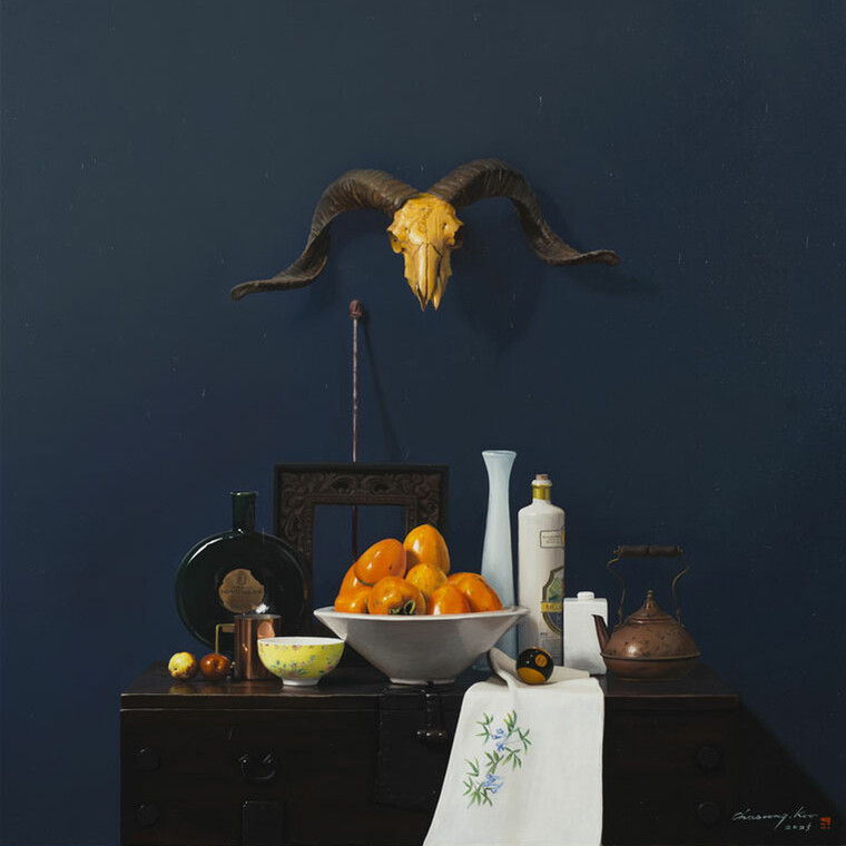 • [작가노트] 그림을 그리는 작업은 새로운 꿈을 꾸는 것이다. 거기 그 사물(being)이 그 적절한 자리에서 하나의 필수 불가결한 아름다운 대상이 되는 것, 그 대상들 하나하나가 나의 분신이 되고, 내 잃어버린 꿈의 파편이 된다. 떠도는 일상의 사물들이 새로운 이름을 주고, 더 아름답게 자리매김할 수 있도록 해 주고 싶다. 그들 각자는 이미 생명을 상실했지만, 하나의 그림이라는 공간에 놓여 짐으로 의미있는 시적 오브제의 재 탄생을 본다. 숨을 쉬는 그림, 그 대상들이 주는 더 미세한 호흡을 찾고 싶다. 마치 그려놓은 대상이 무생물체가 아닌, 무수한 꿈의 파편들이 부서져 그 잔해의 흔적을 극복하고 온전한 오브제가 되기까지 말이다. 상처 투성이의 아픈 심장을 가진 정물들을 나는 나의 그림 속에서 치유한다. 가장 께끗하고 온전한 것으로 표현되어 새로운 힘을 잉태하고 다시 하나의 커다란 힘에 응집되는 새로운 조화와 질서 위에 놓여지길 원한다. 나 스스로도 개입하길 원치않는 단지 거기 그 자리에 그들을 높여주는 일을 할 뿐이다. 그래서 굳이 내가 그들을 통해 무언가 말하려 하지 않아도 된다. 이 리얼리티의 벼랑 끝에서 그것들은 이미 현실의 being 이 아닌 것이다.제 2의 being 이 작품속에서 잉태하는 것이다. 작가 자신은 이제 붓을 내려놓는 이방인일 뿐이다. 작품이 자신들의 자리매김과 저마다의 색깔로 빛을 발할 때 쯤이면 나는 가끔 호흡을 멈춘다. 그들이 호흡하기 때문이다. 하나의 힘 안에 응집된 그들만의 질서, 거기 그 자리에 있어 흔들리지 않는 조화의 아름다움, 사물들 각자가 자존심을 회복하고, 어느날 아침 내가 눈을 떳을 때 그 미지의 공간에 그것들이 사라져 버릴 것 같은 두려움 때문이기도 하다. 새로운 자아의 탄생, 허물을 벗는 새로운 잉태, 벌거벗은 나신의 미지의 순수한 유혹, 그 낯선 시선 속에서 우리를 자각케 하고 체험케 한다. 혹 지나치기 쉬운 사실 안에서 가장 바른 사실의 긍정, 결코 억압하지 않고 자유로울 수 있는 자기 망각의 공간, 결코 세상에 존재하지 않는 참 긍정의 꿈의 영역,이것이 내가 표현하고자 하는 “사실”의 세계이다.