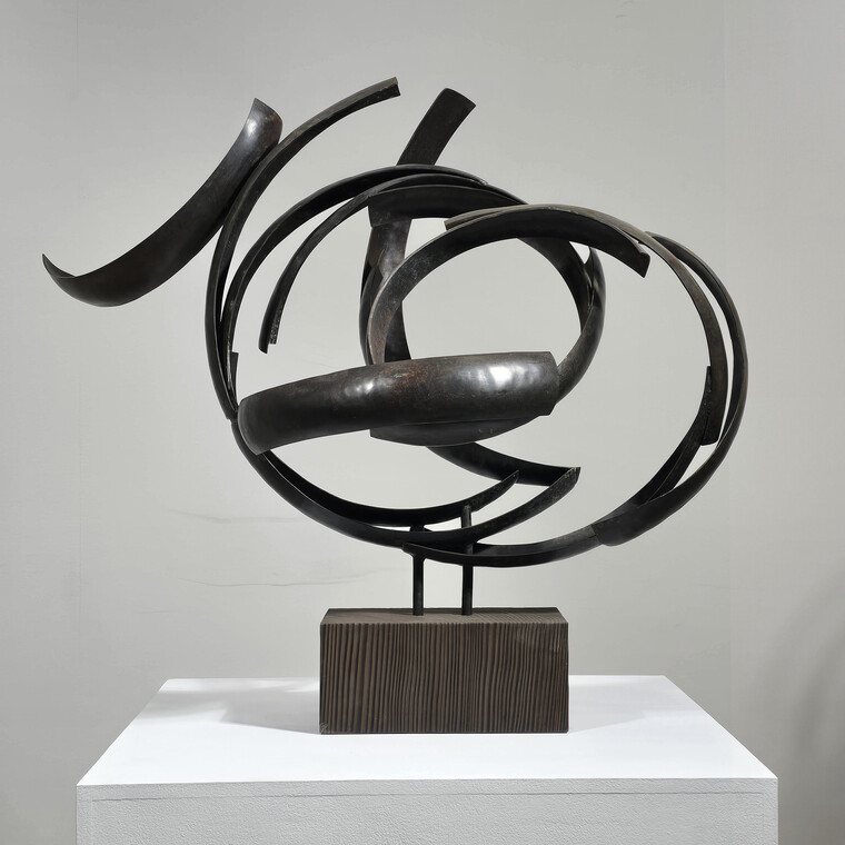 • [작가노트] 생명의 노래와 춤 나의 작업은 자연과 생명, 그리고 그 안에 흐르는 보이지 않는 기운에 대한 사유에서 출발한다. 금속이라는 물질은 본래 무겁고 단단하지만, 나는 그 물성 속에서 율동과 생명성을 끌어내고자 한다. 이는 자연이 지닌 끊임없는 움직임과 생명의 리듬을 형상으로 드러내기 위한 시도이다. 작품에는 우리 전통 문양과 건축, 공예, 벽화 등에 스며 있는 영적 기운이 바탕으로 깔려 있다. 나는 이를 춤에 비유한다. 춤은 형태이면서 동시에 흐름이며, 정지된 순간 속에서도 시간과 에너지를 품고 있다. 금속 조형 역시 그러한 움직임의 기억을 담아내는 매개체가 된다. 무리지어 수면 위를 날아오르는 새들의 모습은 일상의 감각을 깨우는 자연의 은유로 등장한다. 이는 단순한 자연 묘사가 아니라, 현대인의 감각 속에서 점차 희미해지는 생명의 떨림을 환기시키기 위한 장치이다. 작품 속 금속 조각들의 집합은 개별 존재이자 하나의 유기적 흐름을 이루며, 생명의 군무를 이루듯 공간 속에 펼쳐진다. 또한 이 작업은 현대사회에서 잃어가고 있는 원초적인 존재의 기억에 대한 질문이기도 하다. 자연의 생명력과 시간, 공간이 만나는 지점에서 우리는 무엇을 잃었고, 무엇을 되찾아야 하는가를 스스로 묻고자 한다. 사라져가는 자연과 생명의 존엄성은 작품 속에서 하나의 노래가 되어, 가식과 허위로 가득한 문명 속에서도 희망의 가능성을 조용히 들려준다. 한국 건축의 처마선은 나에게 중요한 조형적 모티프이다. 무거운 소재임에도 불구하고 하늘로 날아오르듯 자연과 어우러지는 그 선의 기운은, 생명이 지닌 근원적인 율동과 맞닿아 있다. 나는 금속을 통해 그 본질을 드러내고, 자연과 인간, 전통과 현대가 만나는 접점을 형상화하고자 한다. 이 작업들은 결국, 생명에 대한 경외와 자연과의 조화로운 공존을 향한 나의 지속적인 사유의 기록이다. 2026.2 김 준