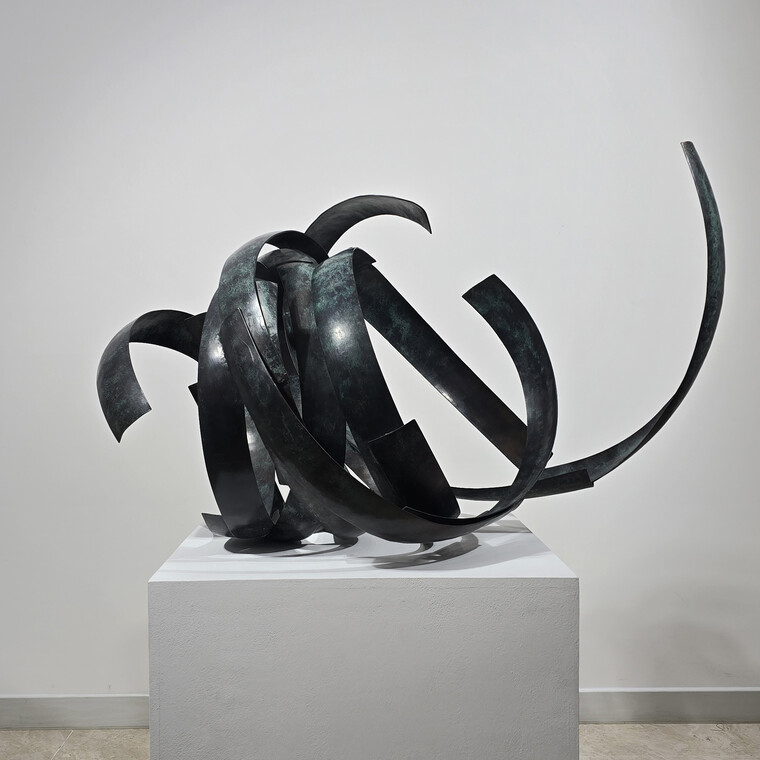 • [작가노트] 생명의 노래와 춤 나의 작업은 자연과 생명, 그리고 그 안에 흐르는 보이지 않는 기운에 대한 사유에서 출발한다. 금속이라는 물질은 본래 무겁고 단단하지만, 나는 그 물성 속에서 율동과 생명성을 끌어내고자 한다. 이는 자연이 지닌 끊임없는 움직임과 생명의 리듬을 형상으로 드러내기 위한 시도이다. 작품에는 우리 전통 문양과 건축, 공예, 벽화 등에 스며 있는 영적 기운이 바탕으로 깔려 있다. 나는 이를 춤에 비유한다. 춤은 형태이면서 동시에 흐름이며, 정지된 순간 속에서도 시간과 에너지를 품고 있다. 금속 조형 역시 그러한 움직임의 기억을 담아내는 매개체가 된다. 무리지어 수면 위를 날아오르는 새들의 모습은 일상의 감각을 깨우는 자연의 은유로 등장한다. 이는 단순한 자연 묘사가 아니라, 현대인의 감각 속에서 점차 희미해지는 생명의 떨림을 환기시키기 위한 장치이다. 작품 속 금속 조각들의 집합은 개별 존재이자 하나의 유기적 흐름을 이루며, 생명의 군무를 이루듯 공간 속에 펼쳐진다. 또한 이 작업은 현대사회에서 잃어가고 있는 원초적인 존재의 기억에 대한 질문이기도 하다. 자연의 생명력과 시간, 공간이 만나는 지점에서 우리는 무엇을 잃었고, 무엇을 되찾아야 하는가를 스스로 묻고자 한다. 사라져가는 자연과 생명의 존엄성은 작품 속에서 하나의 노래가 되어, 가식과 허위로 가득한 문명 속에서도 희망의 가능성을 조용히 들려준다. 한국 건축의 처마선은 나에게 중요한 조형적 모티프이다. 무거운 소재임에도 불구하고 하늘로 날아오르듯 자연과 어우러지는 그 선의 기운은, 생명이 지닌 근원적인 율동과 맞닿아 있다. 나는 금속을 통해 그 본질을 드러내고, 자연과 인간, 전통과 현대가 만나는 접점을 형상화하고자 한다. 이 작업들은 결국, 생명에 대한 경외와 자연과의 조화로운 공존을 향한 나의 지속적인 사유의 기록이다. 2026.2 김 준