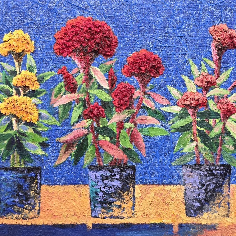 • [작가노트] 맨드라미-나의 삶을 담아 내는 그릇 나만의 표현으로 생명력을 부여해 창조하고 이야기를 쏟아 내려 한다. 나는 꽃을 바라보노라면 시름을 잊는다. 특히나 가공되지 않은 자연의 선물, 들꽃들은 내 영혼을 우주에 뿌리는 듯 자유로움으로 부서트린다. 그리고 내가 그들이 되어 보이는 듯 보이지 않는 듯 거기에 머무른다. 캔버스는 이런 나를 어느덧 훌쩍 옮겨 놓는 장소이다. 마음속에서 정제된 색채를 다루며 마음의 시름을 얹어 놓은 아름다운 형형의 모양새에서 존재의 의미와 위안을 받는다. 여러 들꽃 중에서도 유난히 기억을 잡는 것은 맨드라미 꽃이다. 맨드라미는 모양새만큼이나 꿈틀대며 나의 뇌관을 파고든다. 최근 수년간 작업의 소재로 택한 맨드라미는 그 삶을 담아내는 그릇이다. 그리고 그것들은 내 마음의 표현이다. 너무 소박해 그다지 아름답지도 않지만, 순수가 폭발하여 요염하기까지 한 모습으로의 변화는 볼수록 아름답다. 붉고 여리 여리한 모습에서 뜨거운 한여름을 질주하며 겨울이 되기까지 점차로 누구보다도 굳건하고 강인한 자태로의 변화는 인간의 생과 사를 생각하게 한다. 코트 깃을 여미며 바라보는 빛바랜 맨드라미의 자태는 삶의 절규였다. 서리가 내려앉는 대지의 차가움을 향해 저항하는 그 모습은 처절하게 사랑스럽다. 도도함, 강인함, 꿈틀대는 생의 욕망을 모두 가진 생명체의 이야기를 갖는다. 그래서 나는 그가 되고, 나만의 표현으로 생명력을 부여해 창조하고 이야기를 쏟아 내려 한다. 아~강한 것은 아름답다! 내 안에 뿌리내리는 끝없는 외침이다. 작업에 있어 색과 형상의 생명력을 표현코자 유화물감을 마치 부조 작업 하듯 두껍게 붓질을 반복해 마띠에르를 주었고, 그럼에도 터치를 섬세하게 하여 꽃의 아름다움을 극대화하고 삶의 이야기를 수놓는다. 서양화를 그리고 있지만 현대적이며 한국적 정서를 표현하려고 배경 작업에도 많은 의미를 담았다. 금분이나 숯가루 등은 재료 선택도 그렇고 표현 방식에서도 우리의 한지의 느낌을 살리고자 여러 색의 반복된 채색으로 투명도와 은은함 그리고 질감의 거치름을 추구하였다. 소재를 맨드라미로 단일화하여 작업을 하며 자칫 지루할 수 있는 작업 방향을 색상과 드로잉 방법의 변화로 새로움을 모색해 본다. 실제의 세계와 환영의 세계를 연결해 보려고 한다. 이어지는 작업 방향은 지금까지도 그랬듯이 자연을 그리되 평상의 자연이 아닌 오래도록 고민하고 달여서 우려져 깊게 고찰된 심상의 세계를 그리는 것이다. 그 끝에 존재하는 점이 무엇이든 그것은 나여야 하고, 그리고 맨드라미는 그 세계를 드나드는 출구로 나와 언제나 함께 발걸음을 나선다. [평론] KAMA - 김숙 평론 엥포르멜이 시각적 환영보다는 촉각적 질감의 효과를 냈다면, 김숙 작가의 작품은 촉각적 질감을 통해 시각적 환영을 만드는 특징이 보인다. 또한, 인상주의의 즉흥적 붓 터치와 확연히 다른 의도적이고 계획적인 조형성이 확연하다. 작가는 화면 위에 감각을 실현하는 것에 집중하고 있다. 결과물은 회화와 조소의 경계를 보듯 화면은 맨드라미의 생동감을 강조하고 있다. 시각을 넘어 촉각에 대한 새로운 물성을 만드는 것은 주목할 만하다. 세잔의 입체에 대한 시점변화는 대상의 물성 확보에 대한 새로운 시각이었다. 원근법의 환영이 아닌 회화만의 순수성으로 나가는 길은 물성연구에 대한 새로운 시도가 의미가 있다. 작가는 소재의 사실적 재현과 새로운 해석의 경계선을 넘나든다. 또한, 회화의 순수성을 지향하는 현대미술과 시각적인 쾌감의 극대화 사이에서 자신만의 화면구성과 조형 언어를 구축하여왔다. 화면구성의 새로운 시도들은 원근법의 의존하는 재현을 벗어난 결과를 보여준다. 작가 내면의 반영이며 맨드라미의 자연적 존재가 인간의 삶의 형태와 연 결된다. 작가는 인간의 보편성을 맨드라미라는 친근감 있는 소재에 투영시켜 독특한 이야기를 보여주고 있다. -송민. 중앙일보 칼럼니스트. 미술평론 김 숙의 작품세계 입체적인 형태해석과 조형적인 변주의 조화 - 신항섭(미술평론가) 특정 소재를 집중적으로 다루는 작가의 경우 소재주의 작가라고 한다. 소재주의는 궁극적인 목표인 개별적인 조형세계, 즉 자기정체성을 확립하는 데 지름길이 될 수도 있다. 어느 한 가지 소재에의 천착 및 집중을 통해 자기만의 조형언어를 만들어내는 시간을 단축할 수 있기 때문이다. 실제로 특정의 소재만으로 일가를 이루는 작가들을 심심찮게 볼 수 있는데, 다채로운 소재를 다루는 작가보다 소재주의에 몰입하는 작가가 자신의 정체성을 확보하는데 더 유리할 수도 있음을 말해 준다. 김숙은 맨드라미라는 한 가지 소재에만 전념해왔다. 10여년이 넘는 긴 시간을 맨드라미라는 특정 소재를 다루어왔고, 그 결과 ‘맨드라미 그림’이라고 하면 ‘김 숙’이라는 작가의 존재를 떠올리게 될 정도로 작가적인 지명도를 높이게 됐다. 물론 한 가지 소재에만 전념한다고 해서 작가적인 존재감이 드러나는 것은 아니다. 개별적인 조형언어 및 어법을 갖추지 않고서는 기억되기 어렵다. 다시 말해 남과 다른 시각적인 이