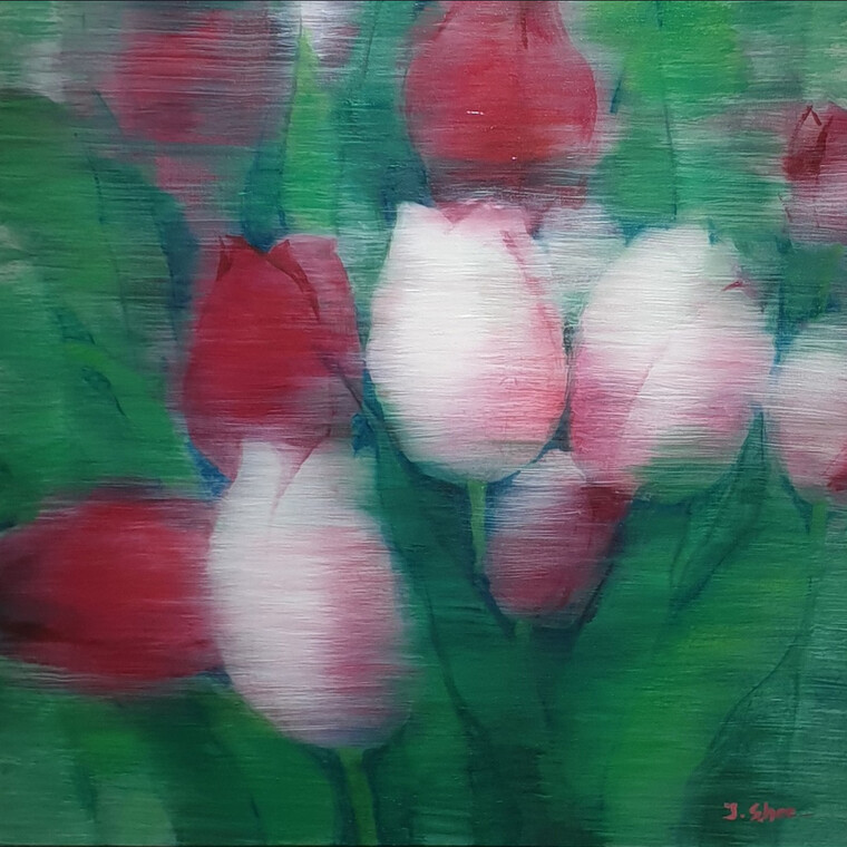 • [평론] 작가의 꽃이 지닌 본래의 다양한 색채들은 여리게 자리한 윤곽선이나 가까스로 출현하는 대상과 함께 밀려난다. 수평으로 칠해나간 붓질의 방향성이 보는 이의 시선과 마음을 이끌고 어디론가 질주한다. 그 사이로 색채들은 뭉개지면서 환각적이고 몽환적인 분위기를 짙게 자아낸다. 선명하기보다는 불투명하고 흐릿하게 번지는 색들은 특정 꽃을 표현하기보다는 그로부터 연유하는 모종의 감정을 막처럼 펼쳐낸다. 근작은 몇 송이 꽃들이 화면 가득 흔들리고 있는 듯한 느낌을 준다. 바람에 뒤척이는 듯도 하고 꿈결에 마주한 것들이기도 하다. 미술과비평(2022.2월호) 박영택 평론가(경기대학교 교수)
